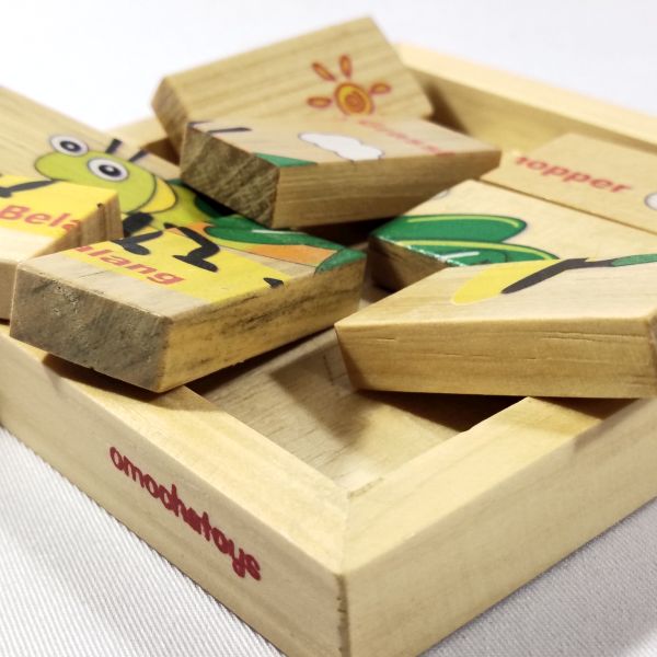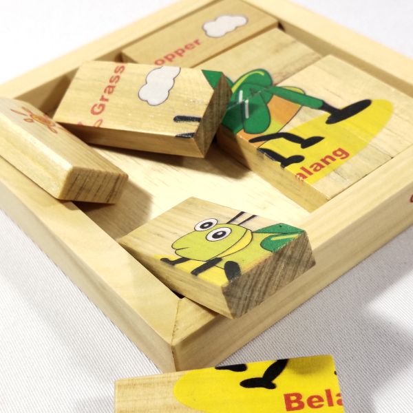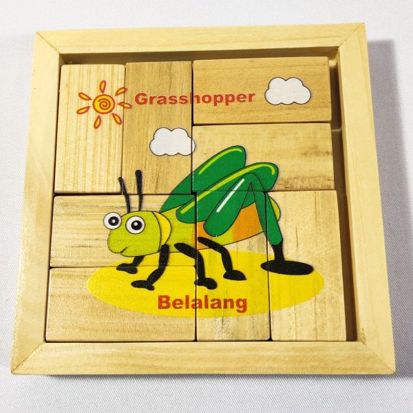 Permainan ini terdiri dari 8 keping kayu ukuran 5 x 2,5 x 1 cm. Disusun membentuk kotak ukuran 10 x 10 cm lalu disablon dengan gambar Belalang. Gambar dibuat dengan teknologi digital LedUV sehingga menghasilkan gambar berkualitas dan aman bagi anak. Berfungsi untuk memecahkan masalah, melatih konsentrasi, koordinasi mata dengan mata. Terdapat berbagai macam gambar buah. Bersertifikat SNI.
